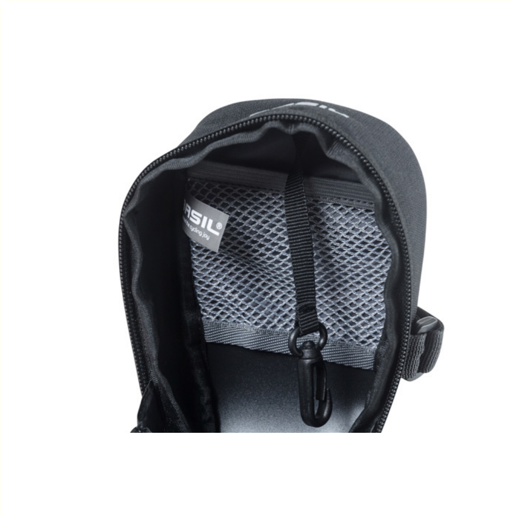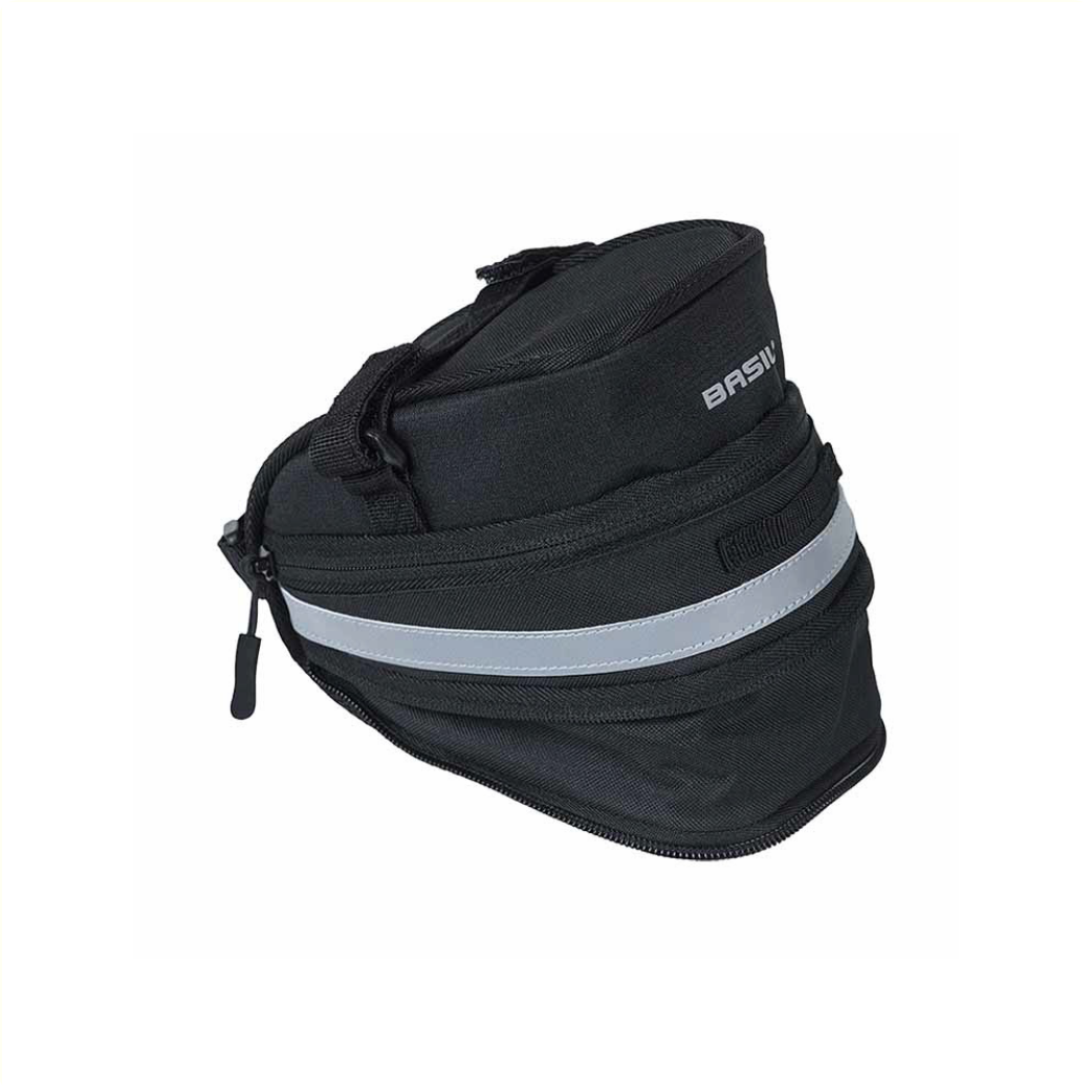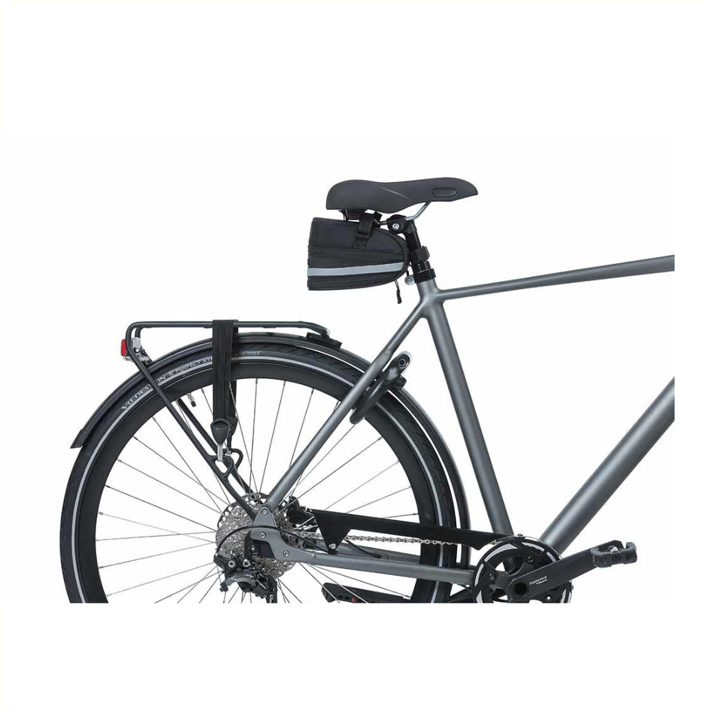 The Basil Mada is a practical black bag that you attach to your bike saddle. With a capacity of 1 liter, you can easily store your bike lock in it, for example. Capacity can be increased from 1 to 1.5 liters