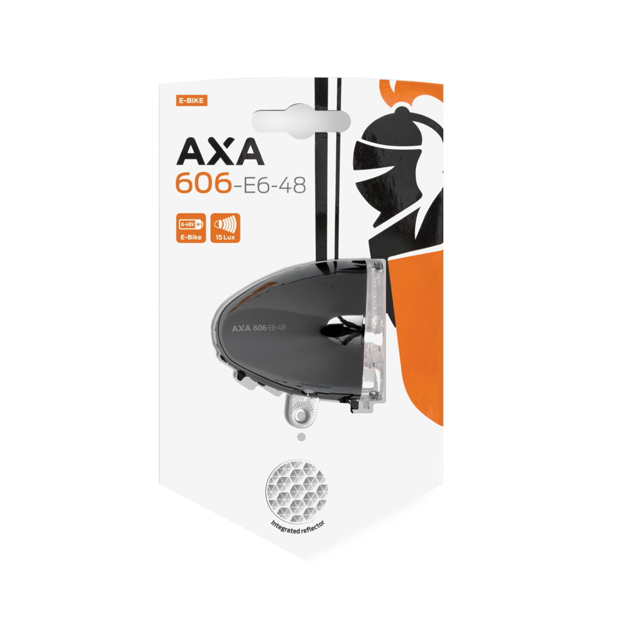 Axa 606 E6-48 Headlight • 15 lux LED lamp • Integrated reflector • Meets German (StVZO) regulations • Specially for connection to 6-48V E-bike battery Retro design • Water and shock resistant