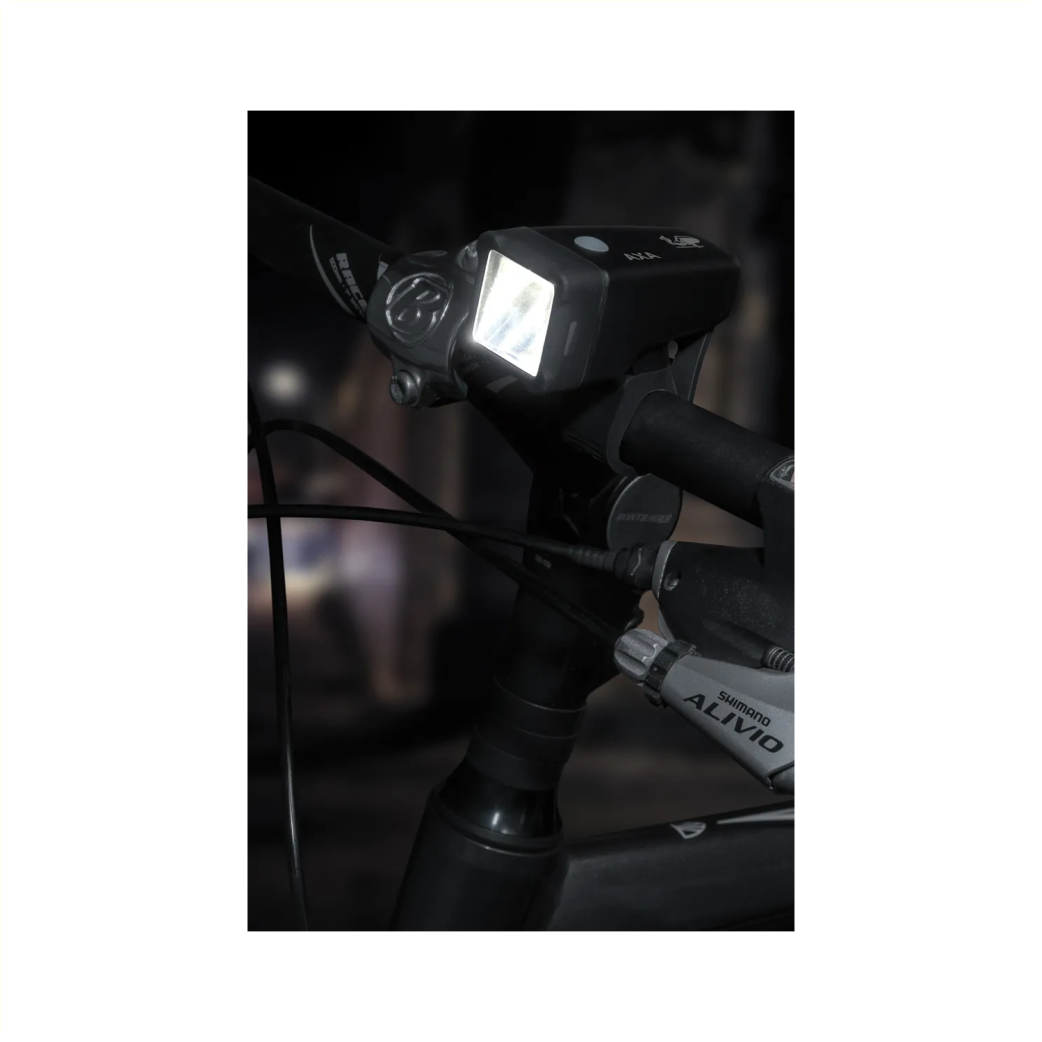 Das AXA Niteline T1 ist ein Set aus einer Taschenlampen-Frontleuchte, die mit AAA-Batterien betrieben wird, und einer Rückleuchte, die mit CR2032-Batterien betrieben wird.