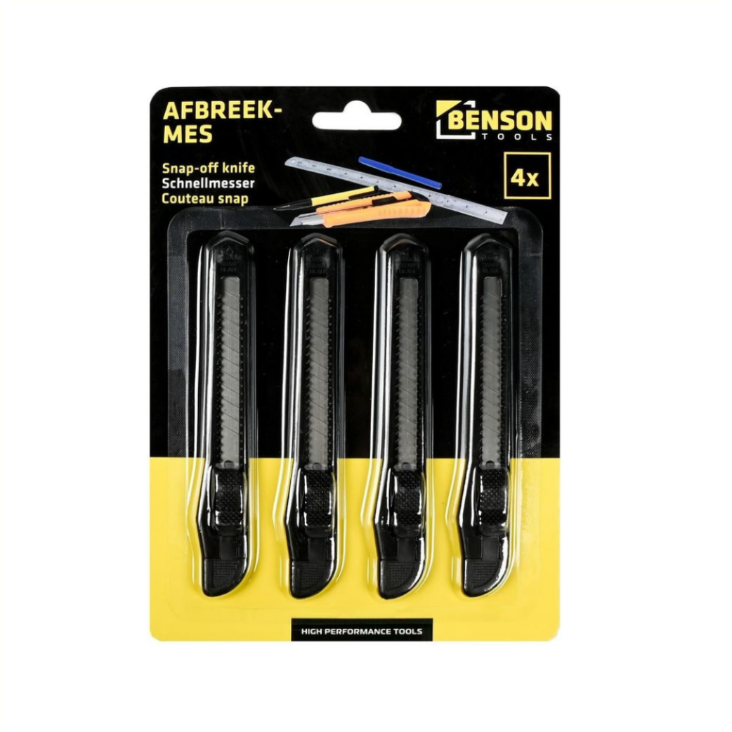 • A handy snap-off knife for hobbyists that is suitable for a variety of cutting jobs in and around the house • 4 Pieces • Plastic and steel • Blade lock • Removable break-off cap