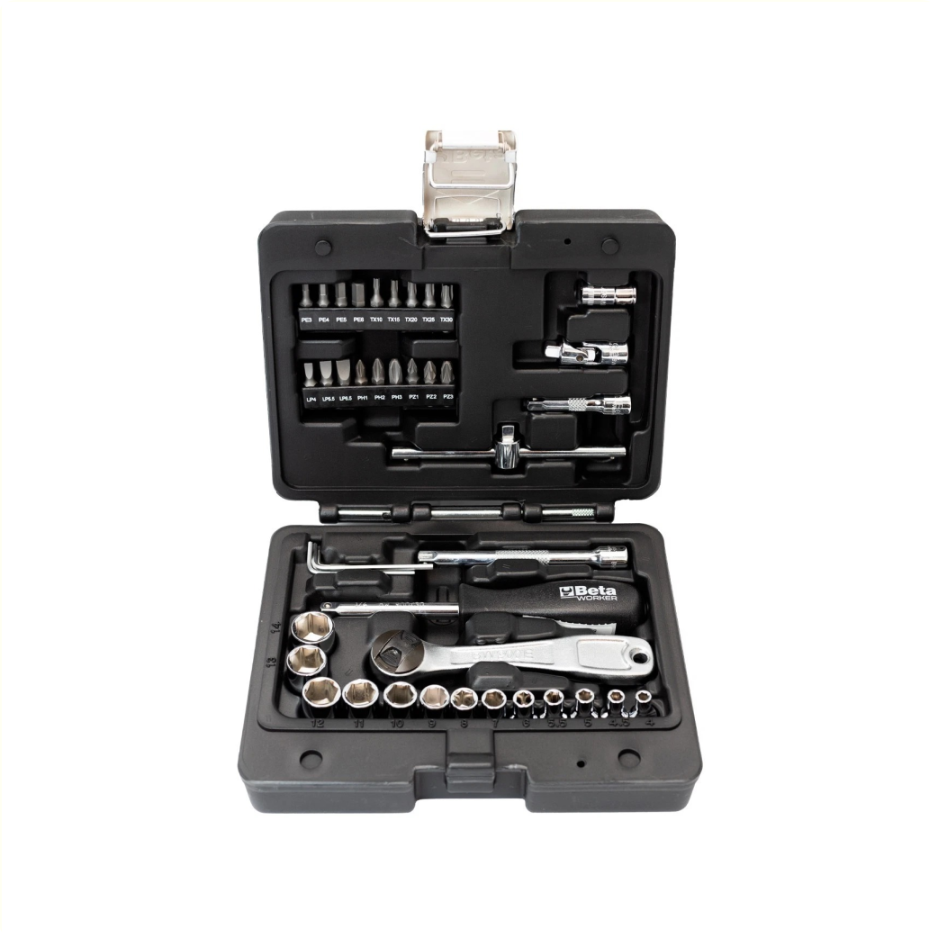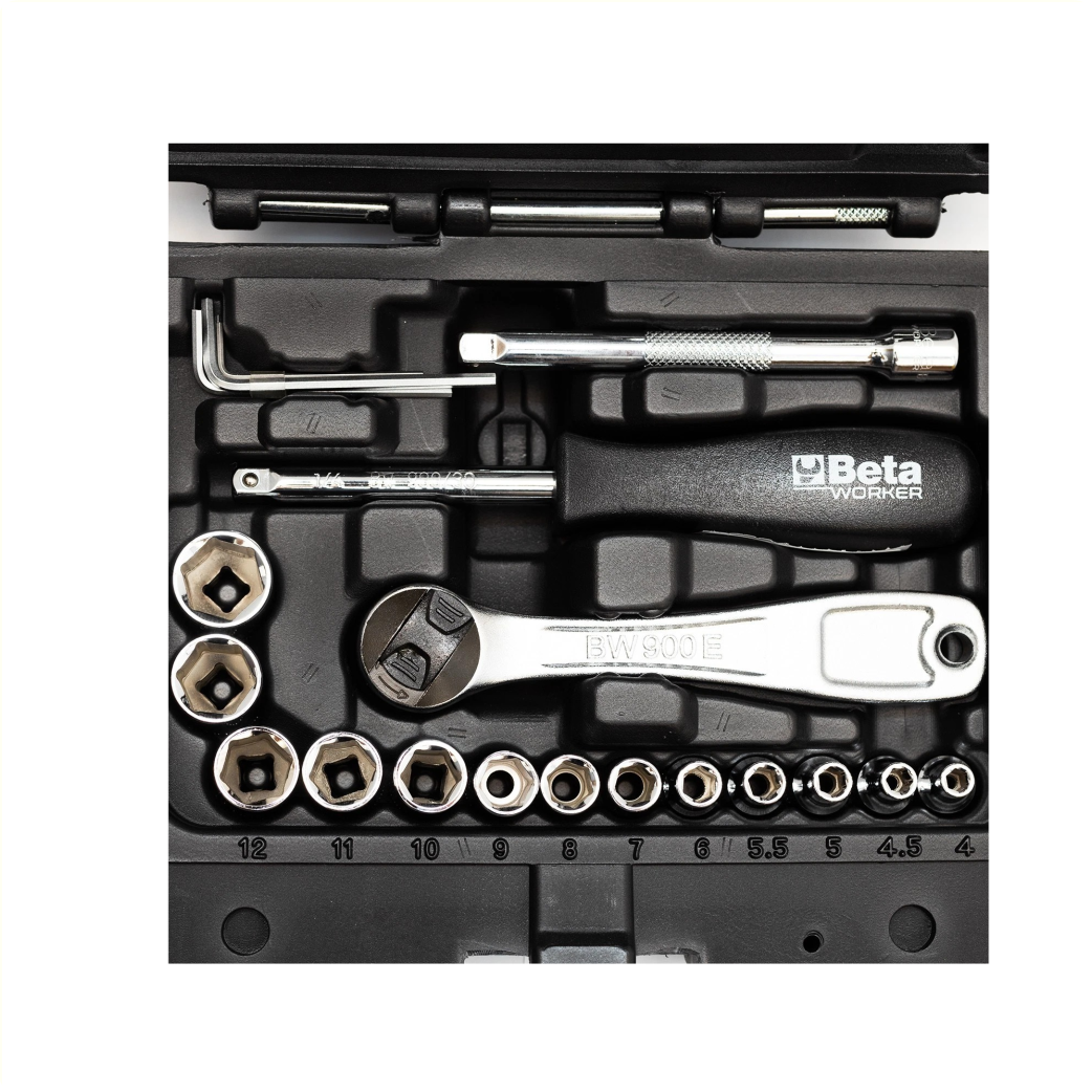 Beautiful socket set from Beta that consists of no less than 98 parts. The set is filled with, among other things, 1/2" and 1/4" sockets. The socket set is sold in a handy tool case.